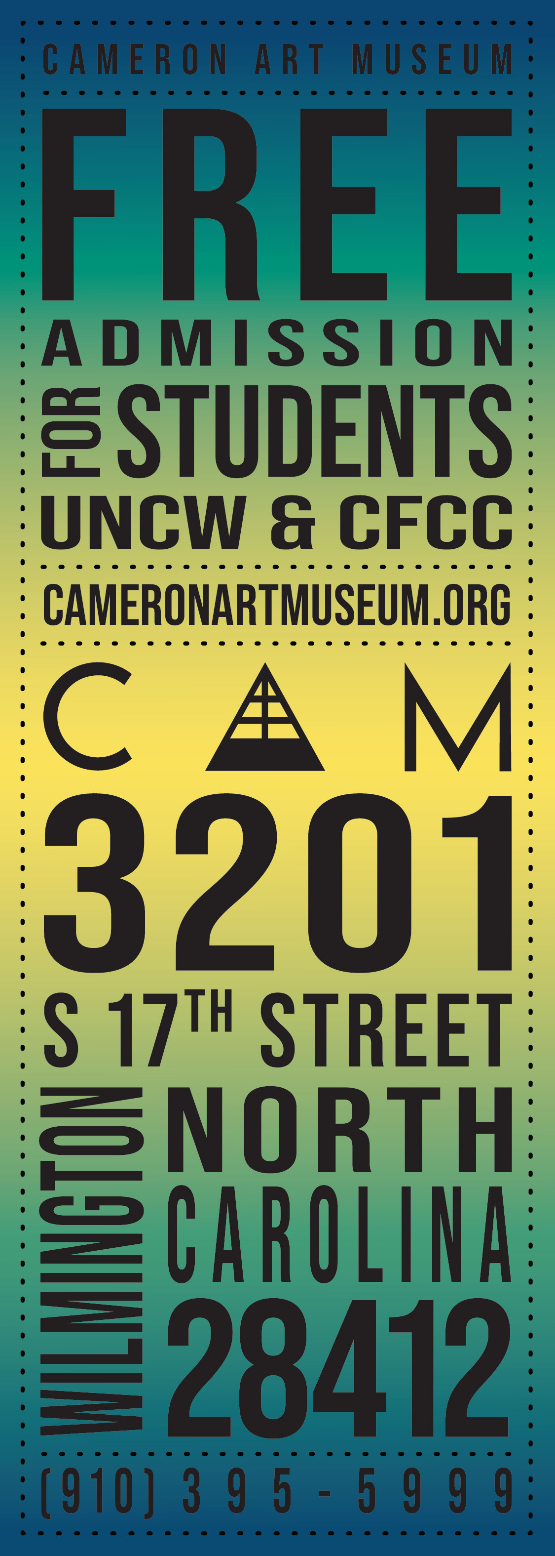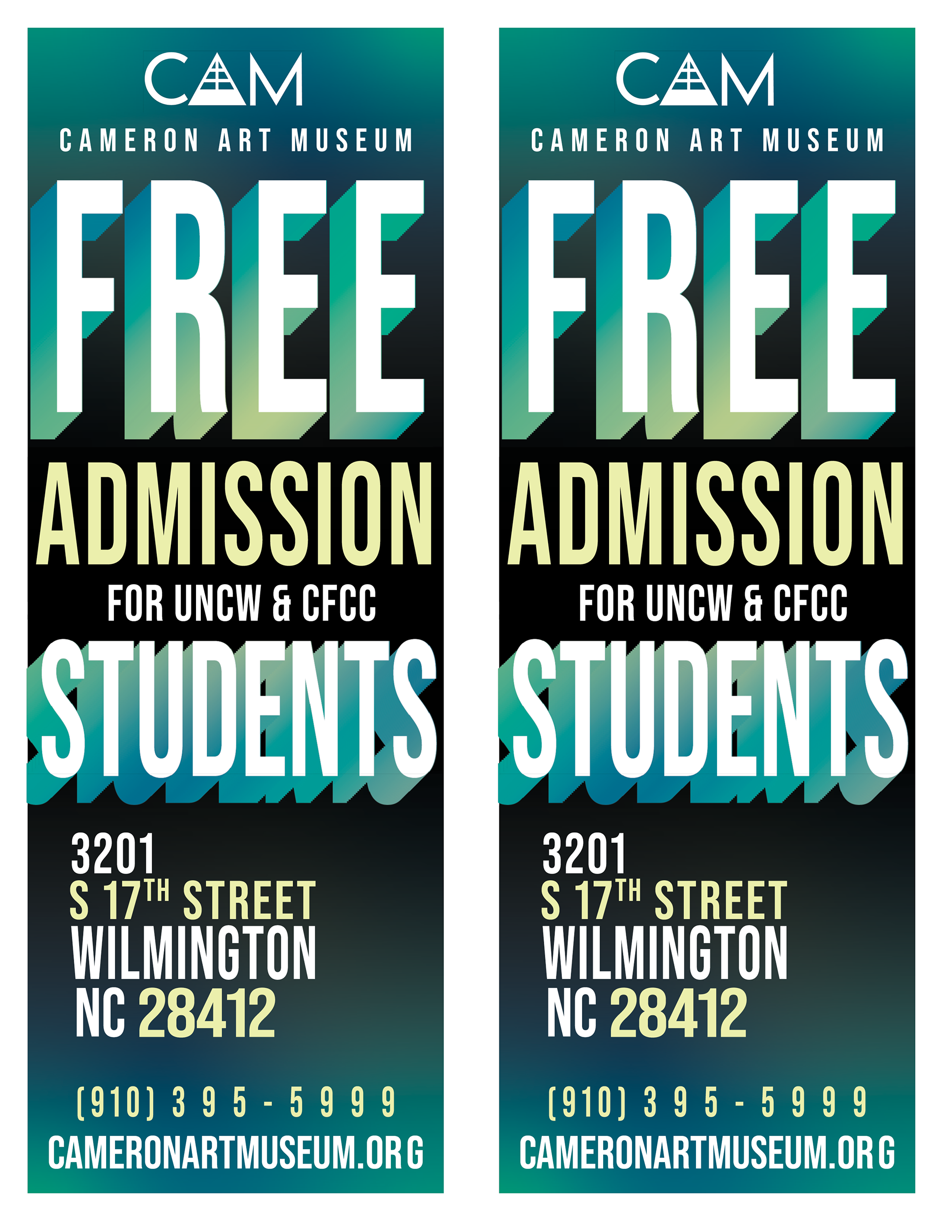 For this project, I was tasked with creating a new student flyer and had full creative range. I designed the layout in Adobe Illustrator, keeping CAM’s brand identity in mind by using the font Bebas Neue Pro, which is often paired with Gotham in their materials. The previous flyer featured a teal and blue gradient reminiscent of UNCW and CFCC, so I created a new freeform gradient to continue appealing to that audience. I wanted to keep the original’s dynamic typography but refresh it with a more playful, modern feel. I was also instructed to make sure “FREE” and “STUDENTS” stood out, so I added a drop-shadow text effect through distort and masked it with the same gradient for consistency. Once the design was finalized, I imported it into InDesign to format it for print.